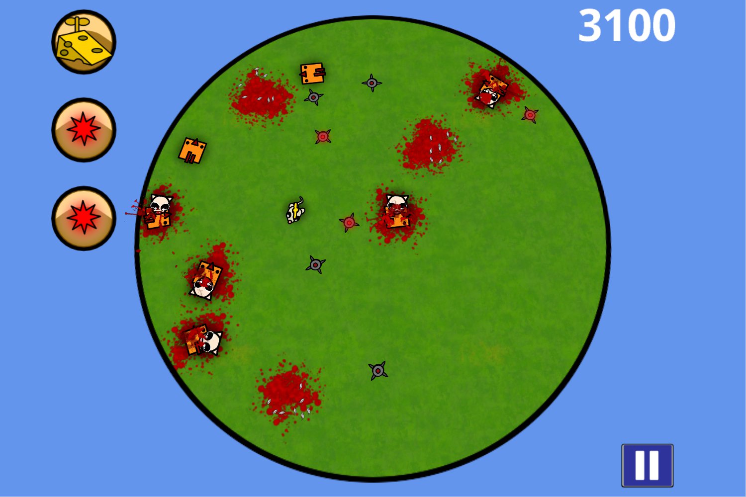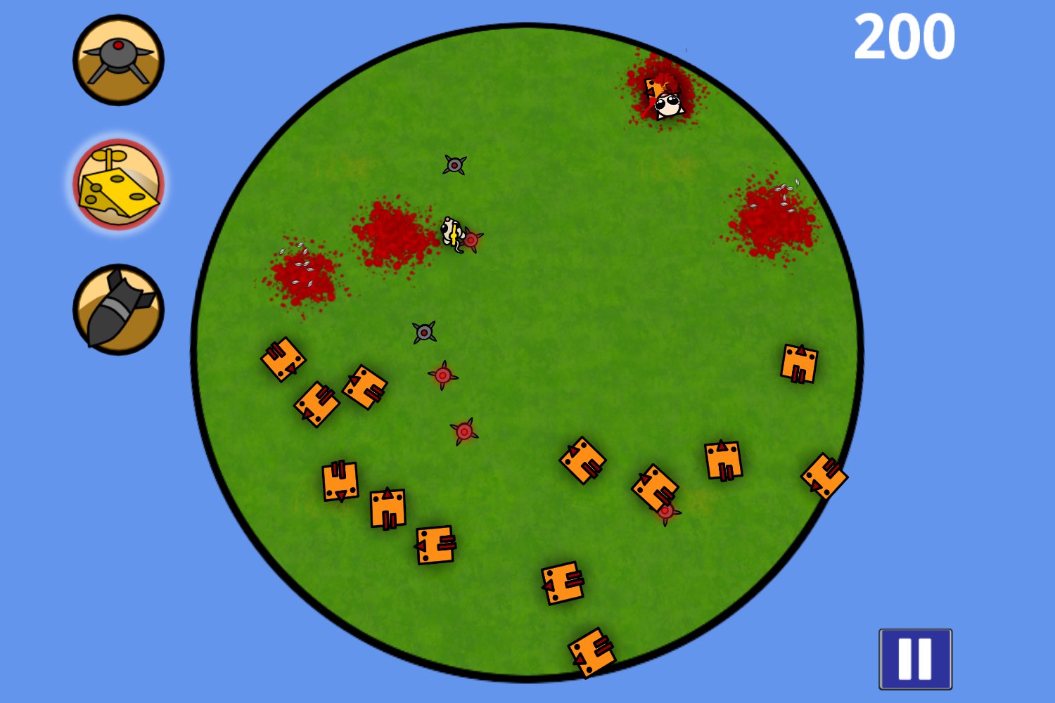 Chickens n Kittens is a top-down action-arcade game that requires the player to use missiles, lasers, lightning, and other weapons to protect their chicken flock against an invading horde of hungry kittens. The player can earn additional, more powerful weapons as the game progresses, which is a good thing, because the kittens only get more numerous, powerful, and hungry. Just be careful not to hurt your chickens! As a wise person once said long ago, "as a missile explodes a kitten, so explodes a chicken."